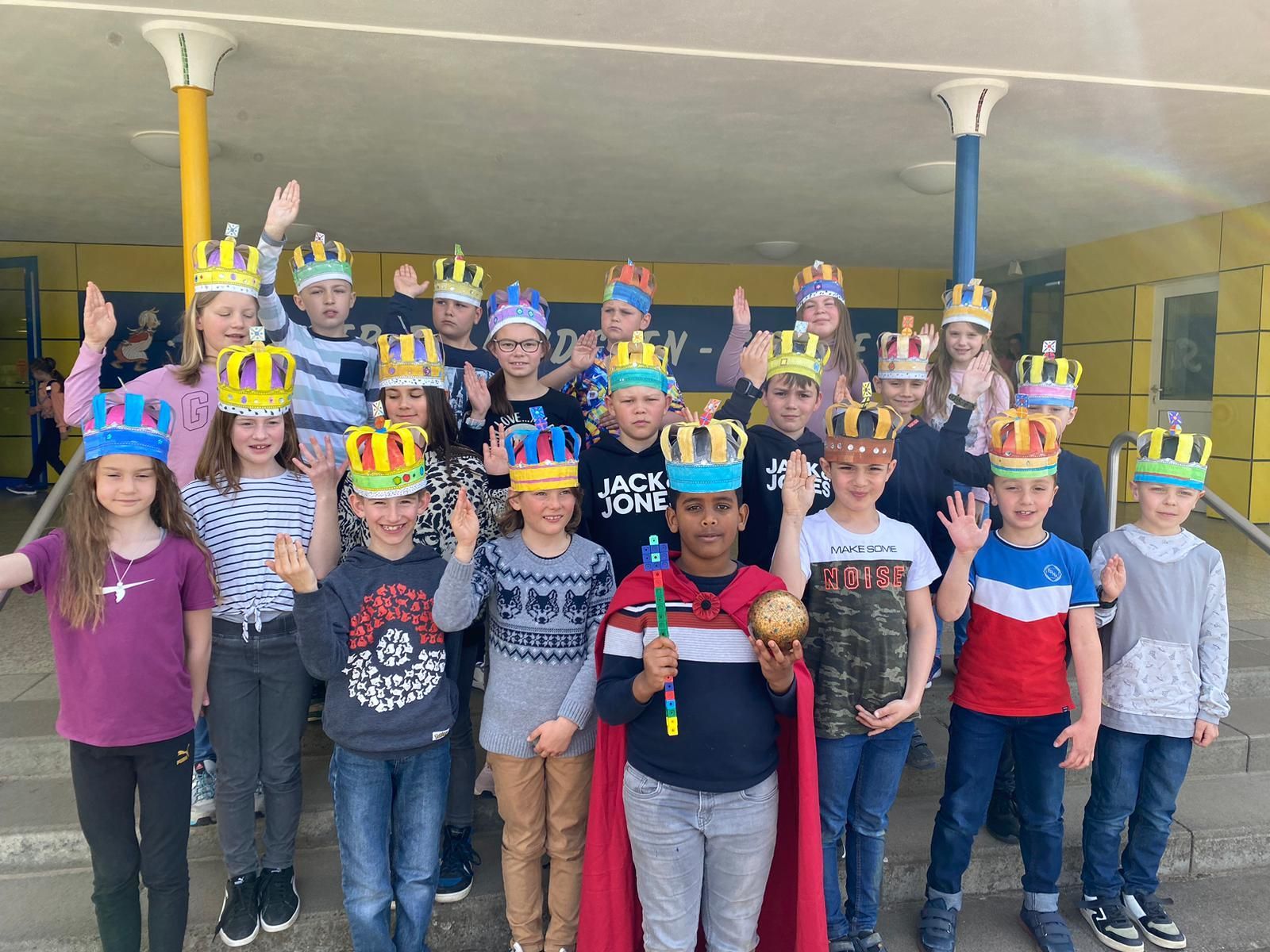 Die Englischklassen 3 und 4 haben sich mit der Krönung von Charles in England beschäftigt, die am 06.05.2023 zu sehen war. Sie haben die Krone gebastelt, mit der er gekrönt wird. Die Kinder lernten auch viel über das Leben von Charles, seiner Exfrau und heutigen Frau. Außerdem schauten sie sich die Gegenstände an, die bei der Krönung verwendet werden, z.B. die Krone mit sehr wertvollen Edelsteinen. Anschließend wurde jedes Kind selbst in einer kleinen Zeremonie mit einem Umhang, einem Zepter und einer Reichskugel gekrönt.