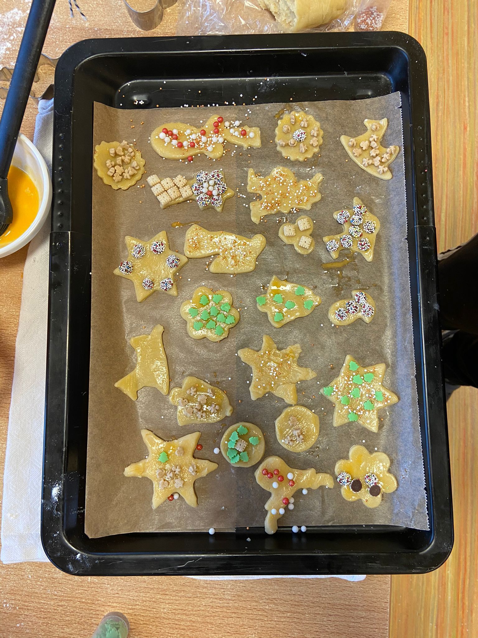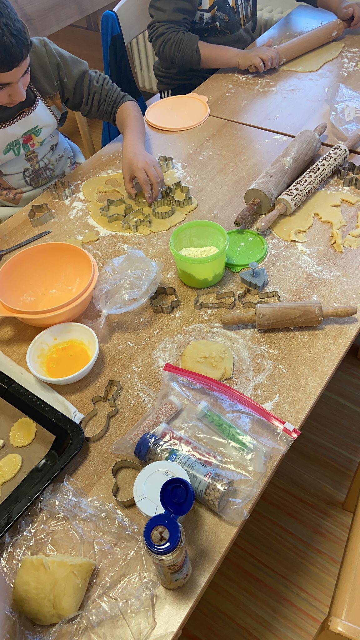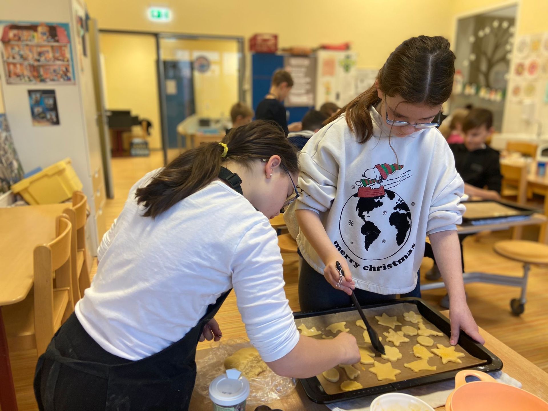 Einige unserer Klassen haben in den Wochen vor Weihnachten einen Tag gemeinsam in der Küche unserer Schule Plätzchen gebacken. Dazu haben einige Kinder jeweils zu Hause einen Plätzchenteig vorbereitet und diesen mitgebracht. Außerdem hatte jeder ein Nudelholz, Ausstechförmchen, Mehl und Streudeko dabei. Während wir den Teig ausgerollt und ausgestochen haben, haben wir Weihnachtsmusik gehört. Nach dem Ausstechen wurden die Plätzchen noch mit Eigelb bestrichen und mit der Deko verziert. Die Bleche wurden nacheinander im Ofen gebacken, bis die Plätzchen goldbraun waren. Am Ende haben wir die Betreuung und die Küche gemeinsam aufgeräumt und unsere gebackenen Plätzchen gegessen.