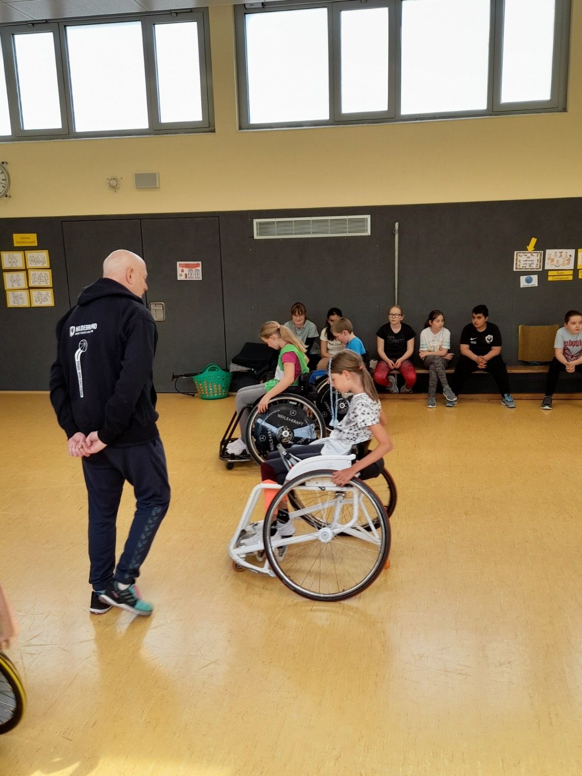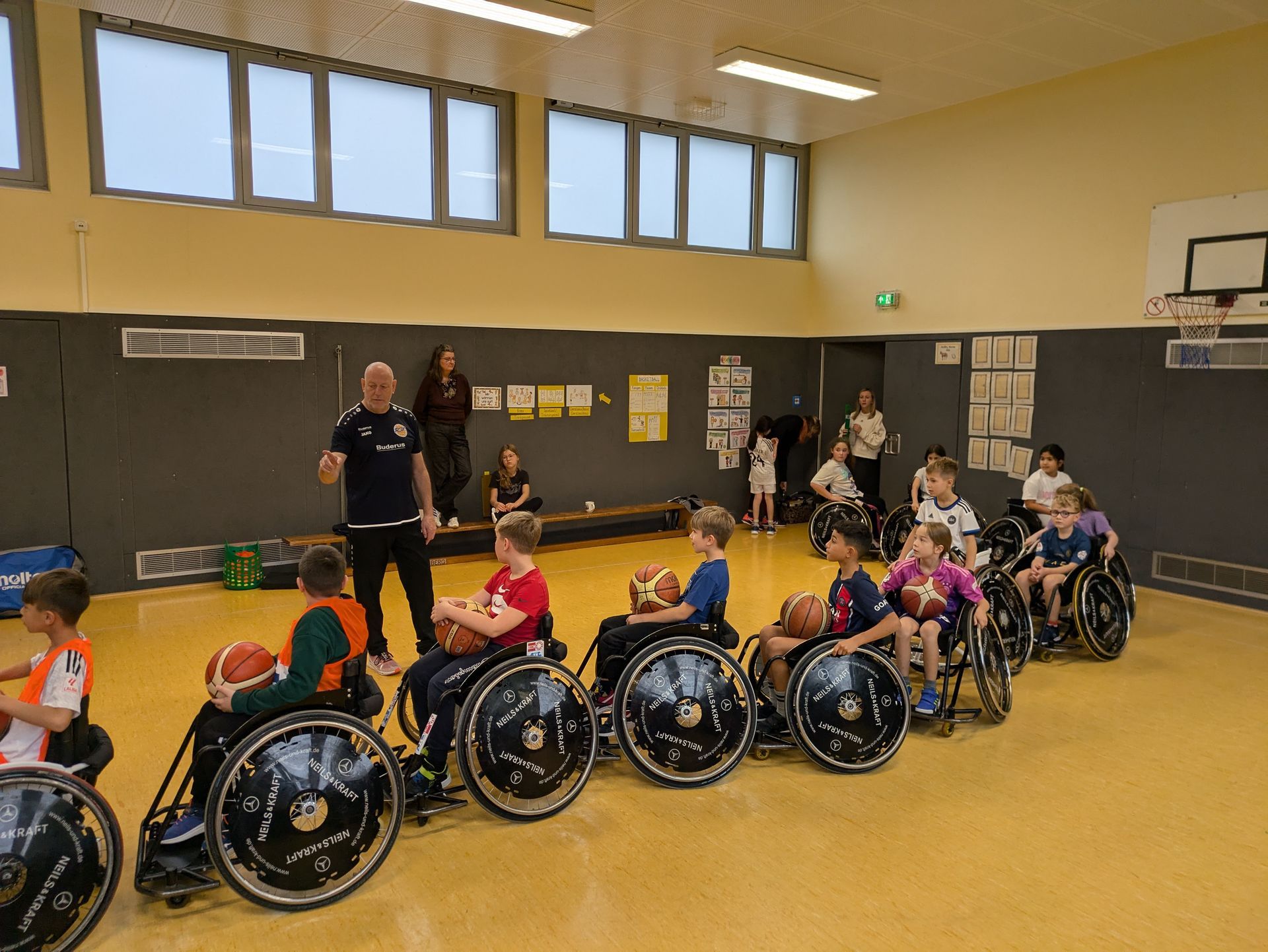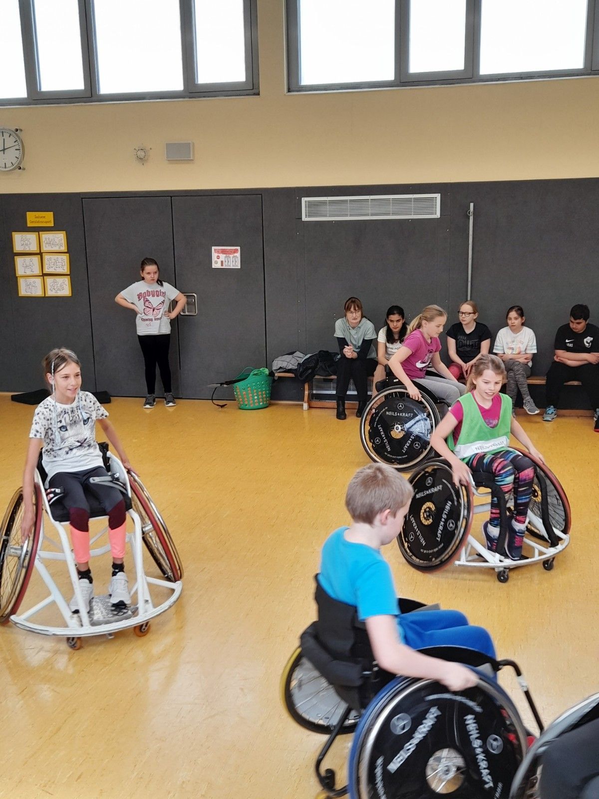 Am Montag den 24.4.2023 bekam die Klasse 4b Besuch vom RSV-Lahn-Dill. Als erstes hat die Klasse die Grundregeln des Rollstuhlbasketballs erklärt bekommen. Danach durften die Kinder die Rollstühle ausprobieren. Sie haben ausprobiert wie man rückwärts und vorwärts fährt. Sie haben mit den Rollstühlen Fangen gespielt. Danach übten sie wie man den Ball mit dem Rad aufhebt. Am Ende haben sie im Vier gegen Vier Basketball gespielt. Ganz am Ende hat der Trainer uns Hefte über die Mannschaft gegeben und jeder der wollte hat ein Autogramm bekommen.
