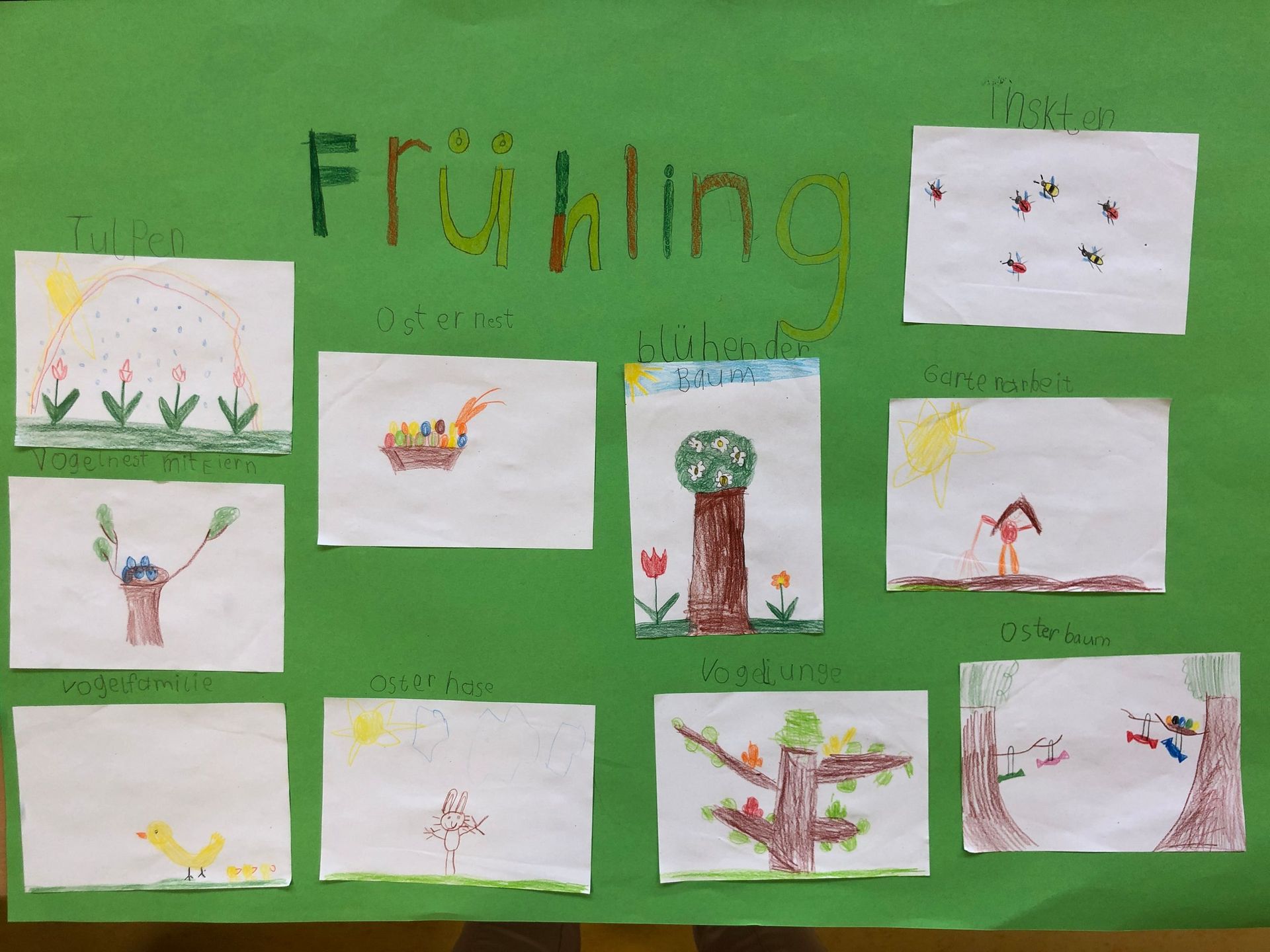 Am Anfang hat die 1a Bilder zu den Jahreszeiten zugeordnet. Danach sollten sie sich in Teams aufteilen und sich eine Jahreszeit aussuchen. Nachdem sollten sie Bilder zu den Jahreszeiten malen die sie haten. Dann haben sie alles auf Plakate aufgeklebt, danach haben sie ihre Plakate vorgestellt.