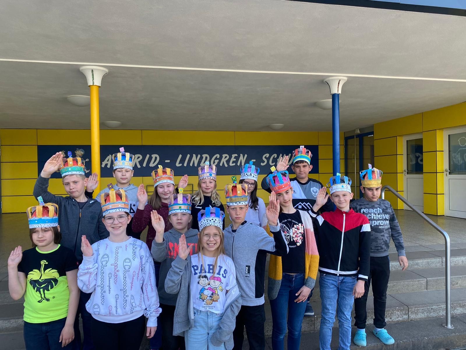 Die Englischklassen 3 und 4 haben sich mit der Krönung von Charles in England beschäftigt, die am 06.05.2023 zu sehen war. Sie haben die Krone gebastelt, mit der er gekrönt wird. Die Kinder lernten auch viel über das Leben von Charles, seiner Exfrau und heutigen Frau. Außerdem schauten sie sich die Gegenstände an, die bei der Krönung verwendet werden, z.B. die Krone mit sehr wertvollen Edelsteinen. Anschließend wurde jedes Kind selbst in einer kleinen Zeremonie mit einem Umhang, einem Zepter und einer Reichskugel gekrönt.